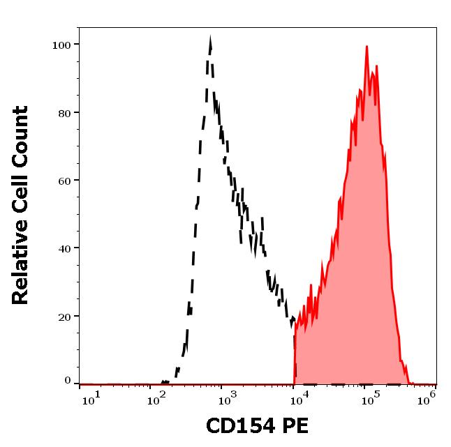 Separation of human CD154 positive lymphocytes (red-filled) from CD154 negative lymphocytes (black-dashed) in flow cytometry analysis (surface staining) of human stimulated (PMA + ionomycin) peripheral blood mononuclear cells stained using anti-human CD154 (24-31) PE antibody (10 μl reagent per milion cells in 100 μl of cell suspension).