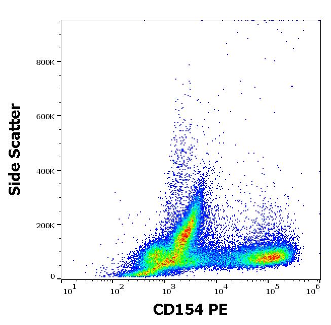 Flow cytometry surface staining pattern of human stimulated (PMA + ionomycin) peripheral blood mononuclear cells stained using anti-human CD154 (24-31) PE antibody (10 μl reagent per milion cells in 100 μl of cell suspension).