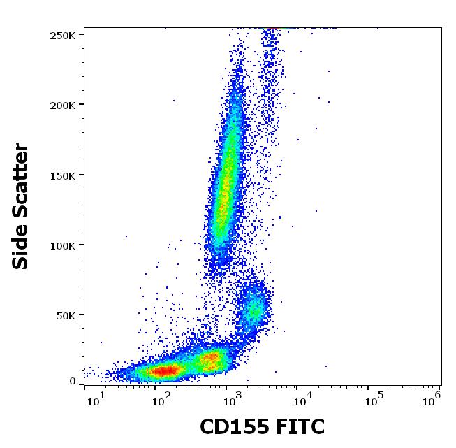 Flow cytometry surface staining pattern of human peripheral whole blood stained using anti-human CD155 (SKII.4) FITC antibody (concentration in sample 0.56 μg/ml).