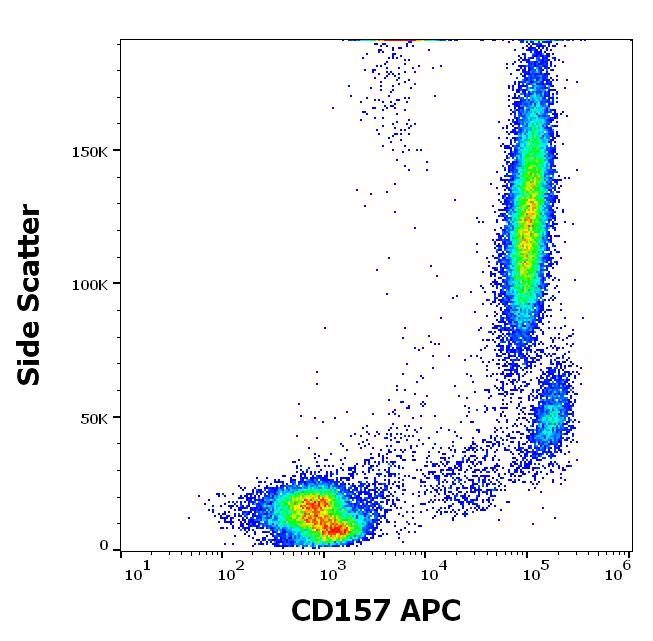 Flow cytometry surface staining pattern of human peripheral whole blood stained using anti-human CD157 (SY11B5) APC antibody (10 μl reagent / 100 μl of peripheral whole blood).