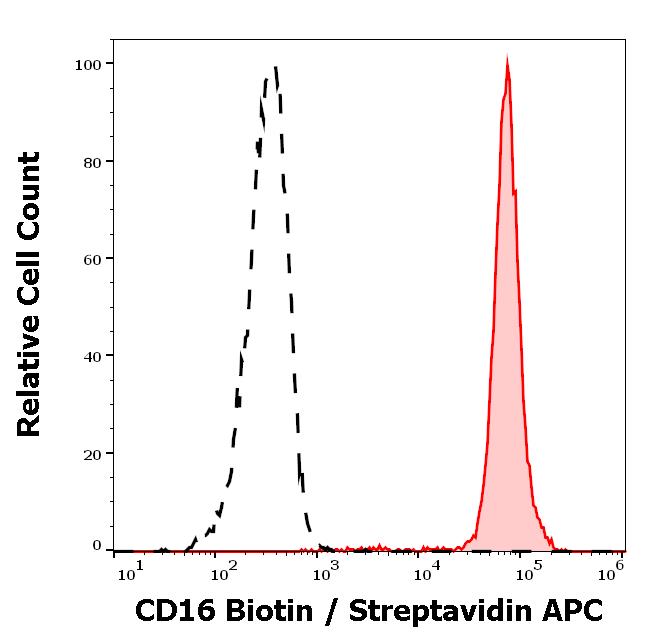 Separation of neutrophil granulocytes stained anti-human CD16 (MEM-154) Biotin antibody (concentration in sample 0,6 μg/ml, Streptavidin APC, red-filled) from neutrophil granulocytes unstained by primary antibody (Streptavidin APC, black-dashed) in flow cytometry analysis (surface staining).