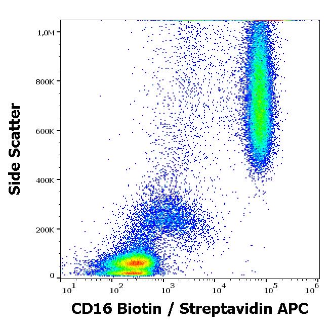 Flow cytometry surface staining pattern of human peripheral whole blood stained using anti-human CD16 (MEM-154) Biotin antibody (concentration in sample 0,6 μg/ml, Streptavidin APC).