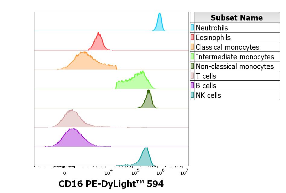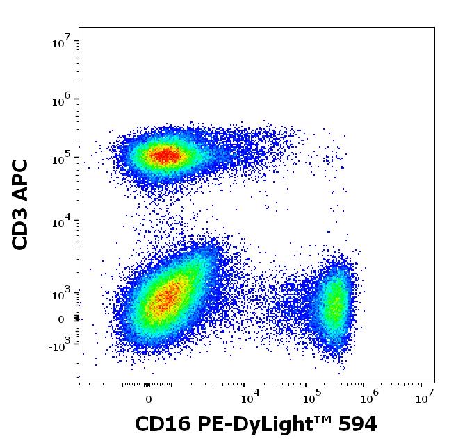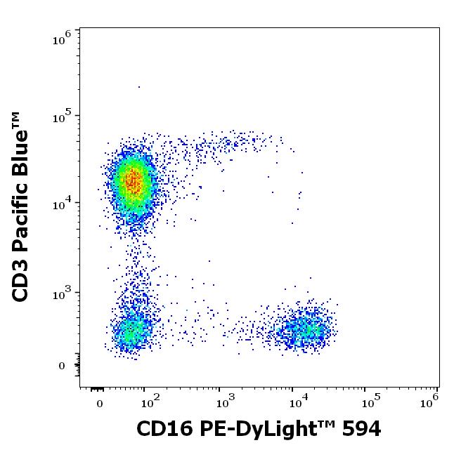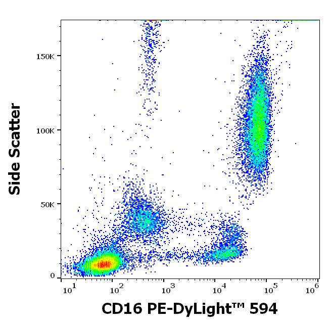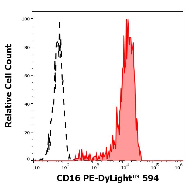 Anti-human CD16 PE-DyLight™ 594 antibody (clone 3G8) works in flow cytometry application.