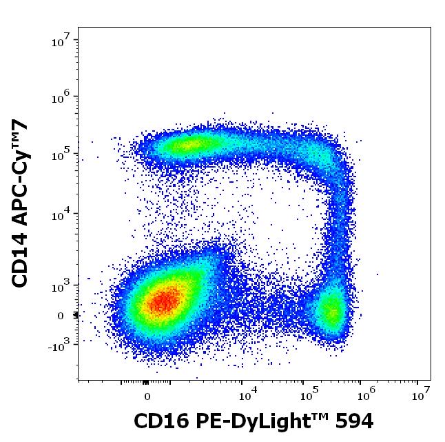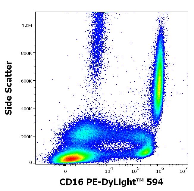 Staining pattern of Anti-human CD16 PE-DyLight™ 594 antibody (clone 3G8) in dot-plot fluorescence visualization (mononuclear gate)