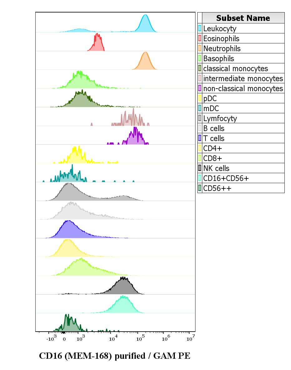 Mouse monoclonal anti-human CD16 purified antibody (clone MEM-168) was used in concentration 2 µg/ml in stained blood sample (2 x 10