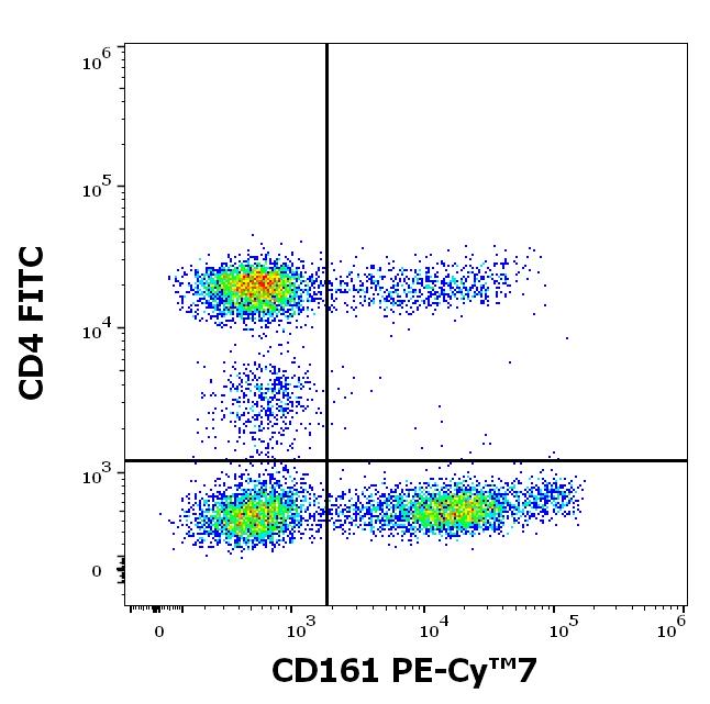 Flow cytometry multicolor surface staining pattern of human lymphocytes stained using anti-human CD161 (HP-3G10) PE-Cy™7 antibody (4 μl reagent / 100 μl of peripheral whole blood) and anti-human CD4 (MEM-241) FITC antibody (20 μl reagent / 100 μl of peripheral whole blood).