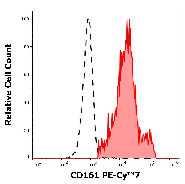 Separation of human CD161 positive CD4 negative lymphocytes (red-filled) from neutrophil granulocytes (black-dashed) in flow cytometry analysis (surface staining) of human peripheral whole blood stained using anti-human CD161 (HP-3G10) PE-Cy™7 antibody (4 μl reagent / 100 μl of peripheral whole blood).