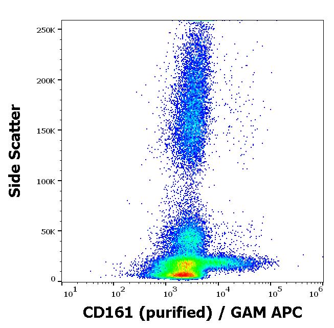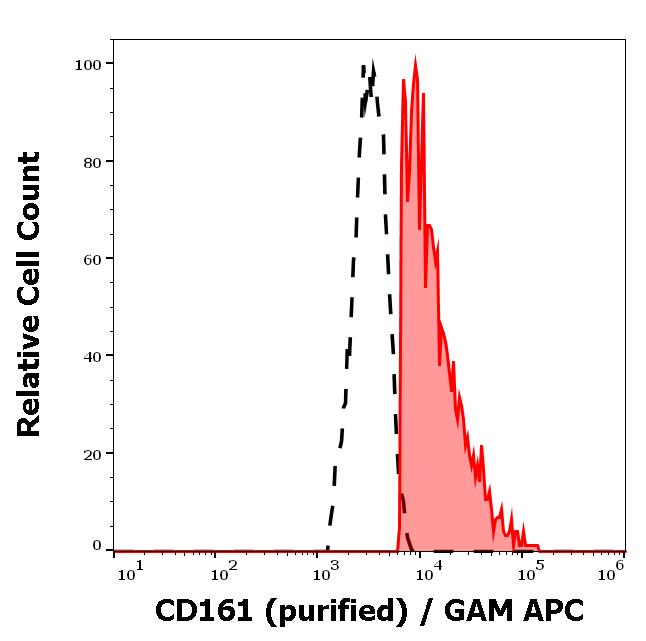 Separation of human CD161 positive lymphocytes (red-filled) from neutrophil granulocytes (black-dashed) in flow cytometry analysis (surface staining) of human peripheral whole blood stained using anti-human CD161 (HP-3G10) purified antibody (concentration in sample 4 μg/ml) GAM APC.