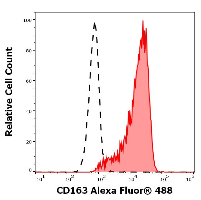 Separation of human monocytes (red-filled) from lymphocytes (black-dashed) in flow cytometry analysis (surface staining) of human peripheral whole blood stained using anti-human CD163 (GHI/61) Alexa Fluor® 488 antibody (4 μl reagent / 100 μl of peripheral whole blood).