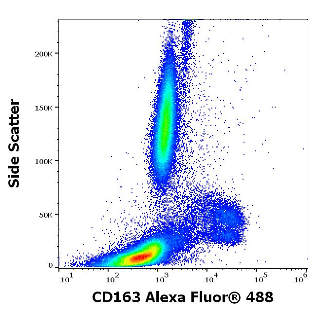 Flow cytometry surface staining pattern of human peripheral whole blood stained using anti-human CD163 (GHI/61) Alexa Fluor® 488 antibody (4 μl reagent / 100 μl of peripheral whole blood).