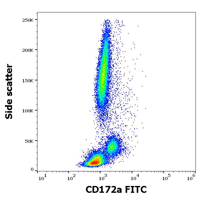 Flow cytometry surface staining pattern of human peripheral whole blood stained using anti-human CD172a (15-414) FITC antibody (4 μl reagent / 100 μl of peripheral whole blood).