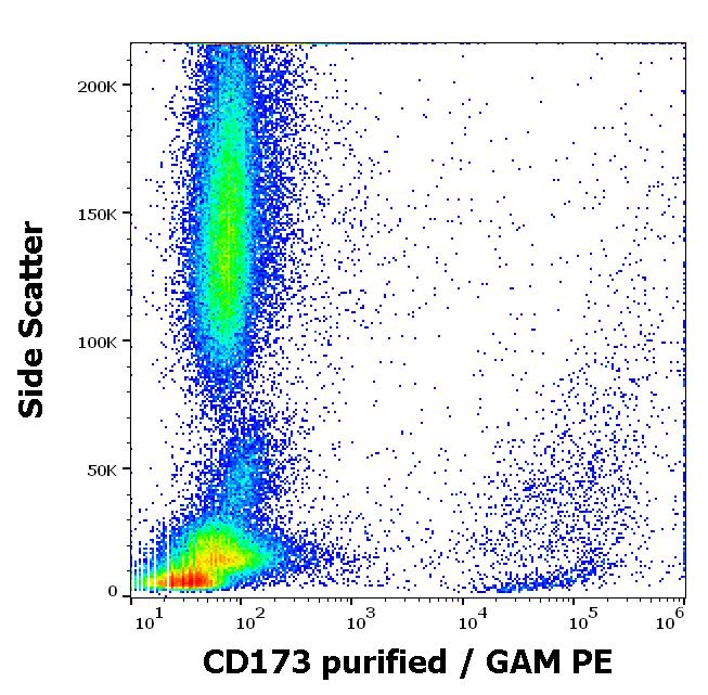 Flow cytometry surface staining pattern of human peripheral whole blood stained using anti-human CD173 (MEM-195) purified antibody (concentration in sample 5 μg/ml, GAM PE).