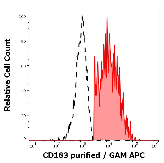 Separation of human CD183 positive lymphocytes (red-filled) from neutrophil granulocytes (black-dashed) in flow cytometry analysis (surface staining) of human peripheral whole blood stained using anti-human CD183 (rHIQB005) purified antibody (concentration in sample 5 μg/ml, GAM APC).