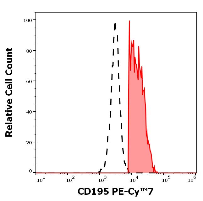 Separation of human CD3 positive CD195 positive T cells (red-filled) from CD3 negative CD195 negative lymphocytes (black-dashed) in flow cytometry analysis (surface staining) of human peripheral whole blood stained using anti-human CD195 (T21/8) PE-Cy™7 antibody (concentration in sample 9 μg/ml).