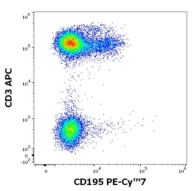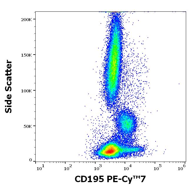Flow cytometry surface staining pattern of human peripheral whole blood stained using anti-human CD195 (T21/8) PE-Cy™7 antibody (concentration in sample 9 μg/ml).