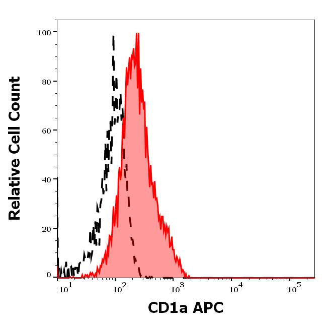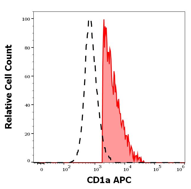 Separation of MOLT-4 cells stained using anti-human CD1a (SK9) APC antibody (concentration in sample 4 μg/m, red-filled) from MOLT-4 cells stained using mouse IgG1 isotype control (MOPC-21) APC antibody (concentration in sample 4 μg/ml, same as CD1a APC concentration, black-dashed) in flow cytometry analysis (surface staining).