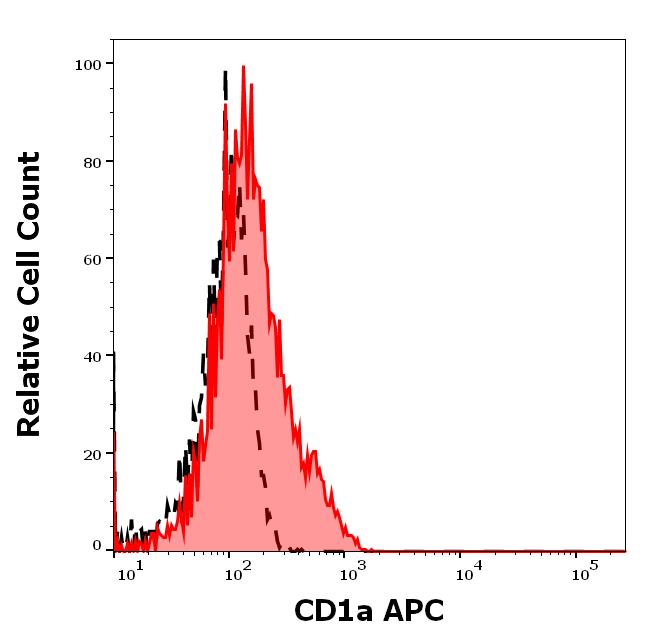 Separation of MOLT-4 cells stained using anti-human CD1a (HI149) APC antibody (concentration in sample 4 μg/m, red-filled) from MOLT-4 cells stained using mouse IgG1 isotype control (MOPC-21) APC antibody (concentration in sample 4 μg/ml, same as CD1a APC concentration, black-dashed) in flow cytometry analysis (surface staining).