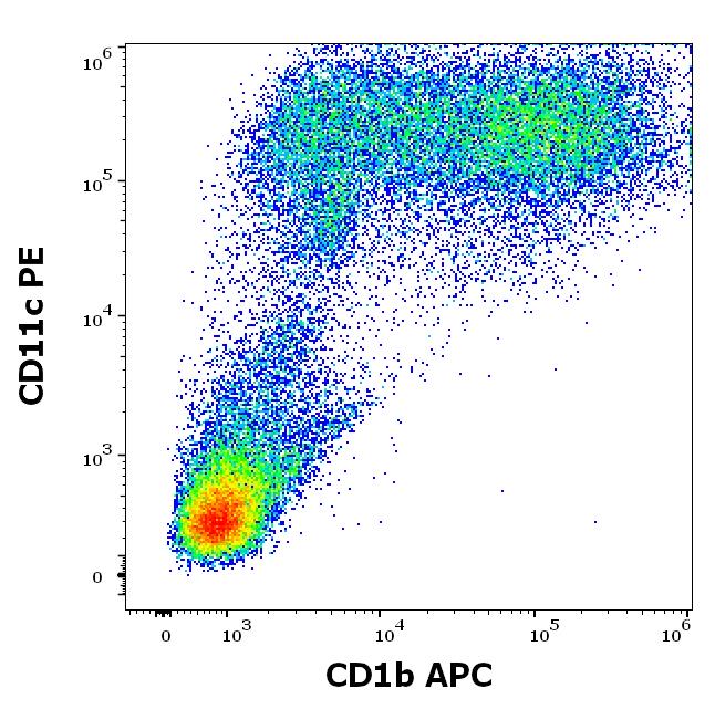 Flow cytometry multicolor surface staining pattern of human stimulated (GM-CSF + IL-4) peripheral blood mononuclear cells using anti-human CD1b (SN13) APC antibody (10 μl reagent per milion cells in 100 μl of cell suspension) and anti-human CD11c (BU15) PE antibody (20 μl reagent per milion cells in 100 μl of cell suspension).