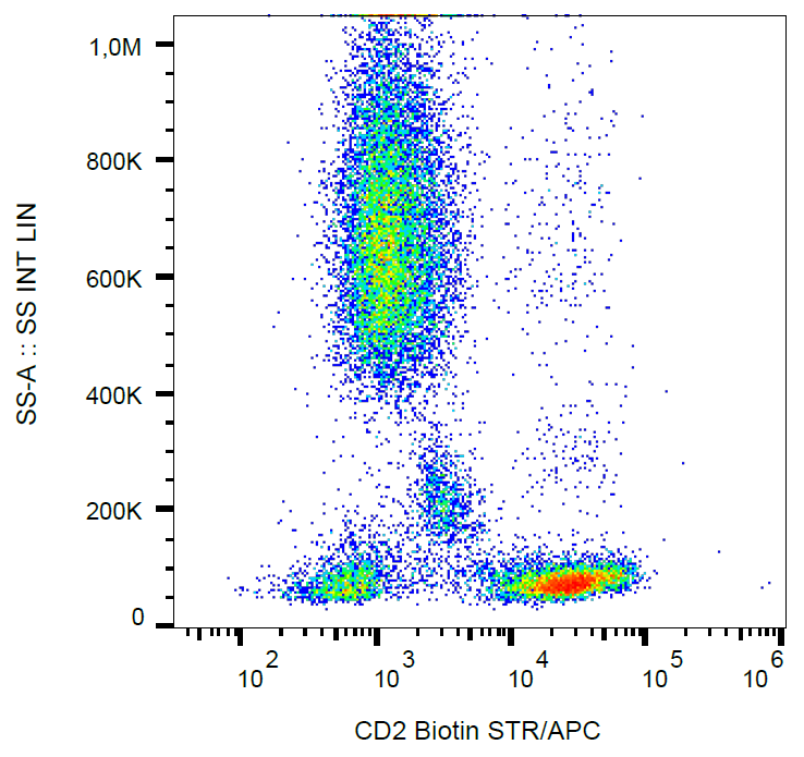 Flow cytometry analysis (surface staining) of human peripheral blood with anti-human CD2 (MEM-65) biotin, streptavidin-APC.