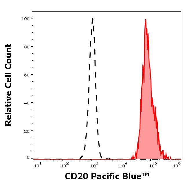 Separation of human CD20 positive lymphocytes (red-filled) from neutrophil granulocytes (black-dashed) in flow cytometry analysis (surface staining) of human peripheral whole blood stained using anti-human CD20 (2H7) Pacific Blue™ antibody (concentration in sample 1 μg/ml).