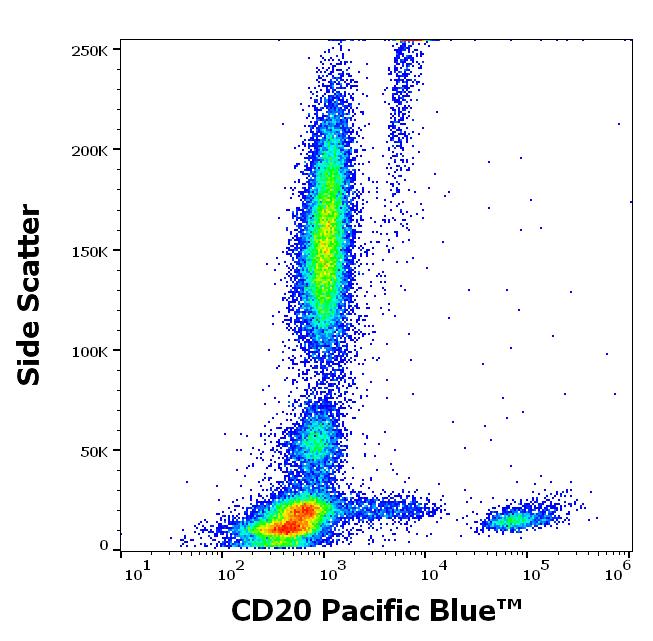 Flow cytometry surface staining pattern of human peripheral whole blood stained using anti-human CD20 (2H7) Pacific Blue™ antibody (concentration in sample 1 μg/ml).