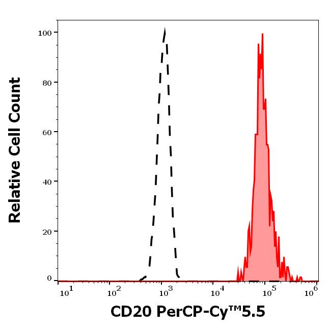 Separation of human CD20 positive lymphocytes (red-filled) from neutrophil granulocytes (black-dashed) in flow cytometry analysis (surface staining) of human peripheral whole blood stained using anti-human CD20 (2H7) PerCP-Cy™5.5 antibody (concentration in sample 1.67 μg/ml).