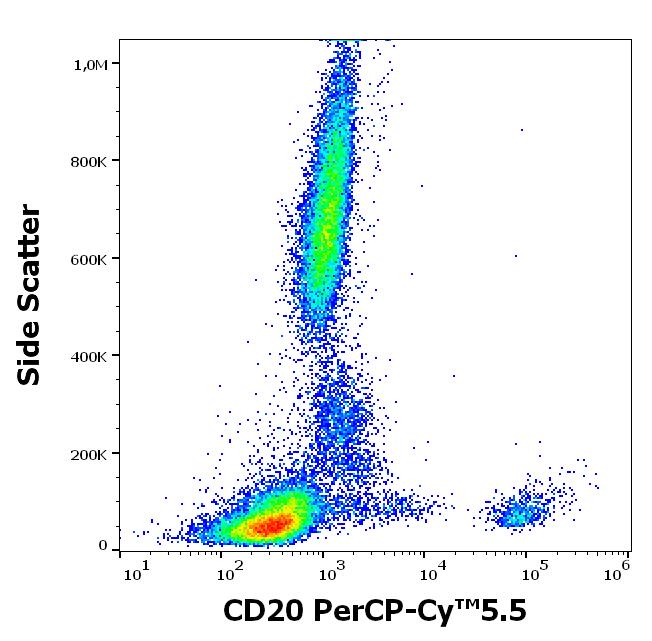 Flow cytometry surface staining pattern of human peripheral whole blood stained using anti-human CD20 (2H7) PerCP-Cy™5.5 antibody (concentration in sample 1.67 μg/ml).