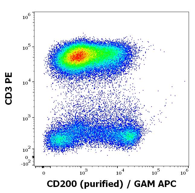 Flow cytometry multicolor surface staining of human lymphocytes stained using anti-human CD3 (UCHT1) PE antibody (20 μl reagent / 100 μl of peripheral whole blood) and anti-human CD200 (OX-104) purified antibody (concentration in sample 4 μg/ml) GAM APC.