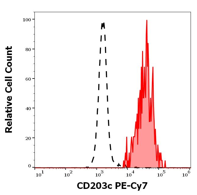 Separation of human CD203c positive basophil granulocytes (red-filled) from neutrophil granulocytes (black-dashed) in flow cytometry analysis (surface staining) of anti-IgE antibody stimulated human peripheral whole blood stained using anti-human CD203c (NP4D6) PE-Cy™7 antibody (4 μl reagent / 100 μl of peripheral whole blood).