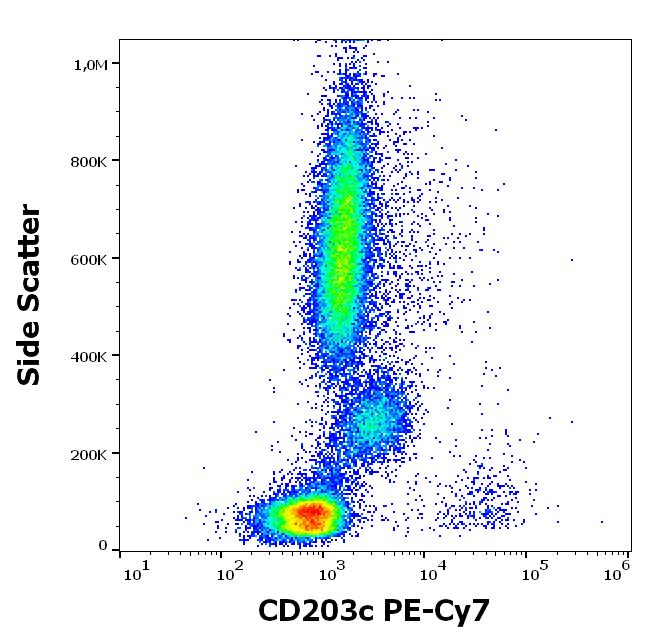 Flow cytometry surface staining pattern of anti-IgE antibody stimulated human peripheral whole blood stained using anti-human CD203c (NP4D6) PE-Cy™7 antibody (4 μl reagent / 100 μl of peripheral whole blood).