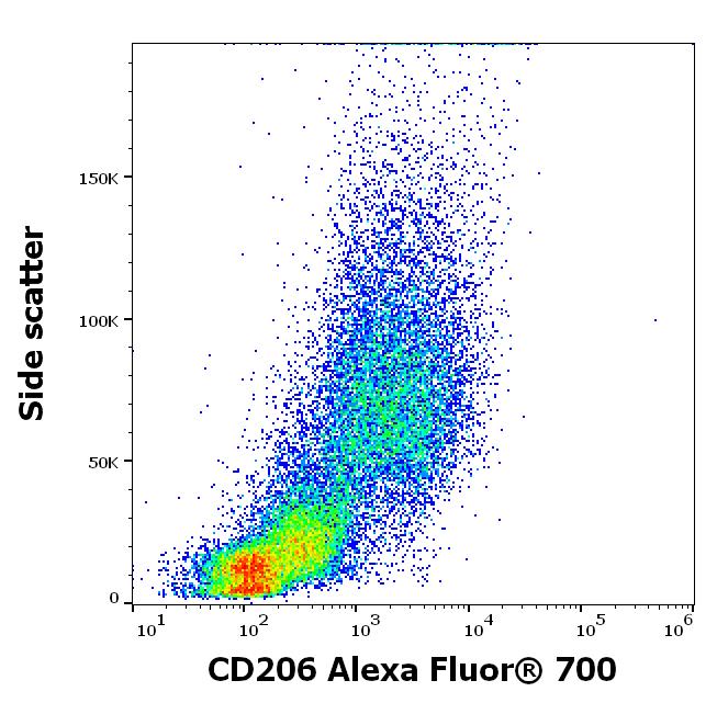 Flow cytometry surface staining pattern of stimulated (GM-CSF + IL-4) peripheral blood mononuclear cells stained using anti-human CD206 (15.2) Alexa Fluor® 700 antibody (4 μl reagent per million cells in 100 μl of cell suspension, red-filled).