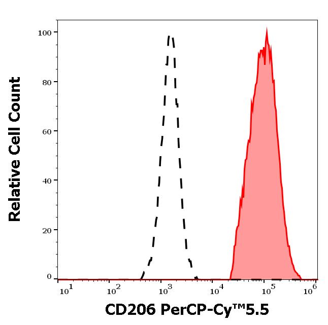 Separation of human CD206 positive CD11c positive dendritic cells differentiated upon monocyte stimulation (GM-CSF + IL-4) (red-filled) from non-stimulated lymphocytes (black-dashed) in flow cytometry analysis (surface staining) of human stimulated (GM-CSF + IL-4) peripheral blood mononuclear cells stained using anti-human CD206 (15-2) PerCP-Cy™5.5 antibody (4 μl reagent / 100 μl of peripheral whole blood).
