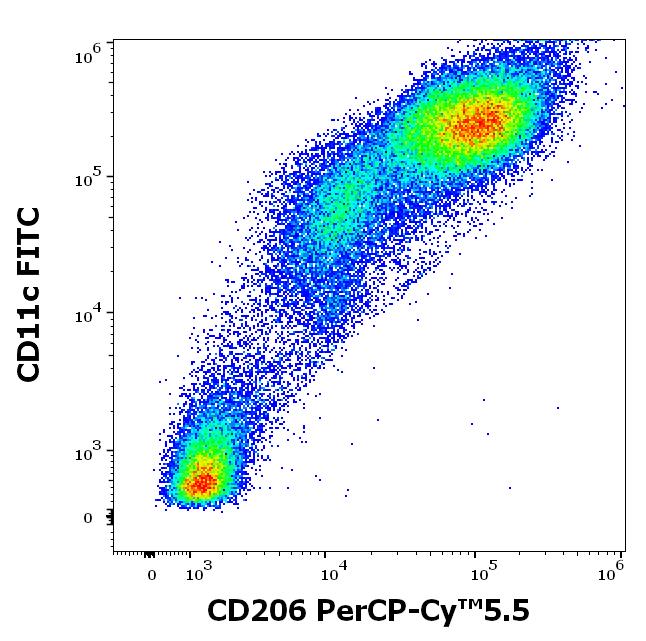 Flow cytometry multicolor surface staining of human stimulated (GM-CSF + IL-4) peripheral blood mononuclear cells stained using anti-human CD206 (15-2) PerCP-Cy™5.5 antibody (4 μl reagent per milion cells in 100 μl of cell suspension) and anti-human CD11c (BU15) APC antibody (10 μl reagent per milion cells in 100 μl of cell suspension).