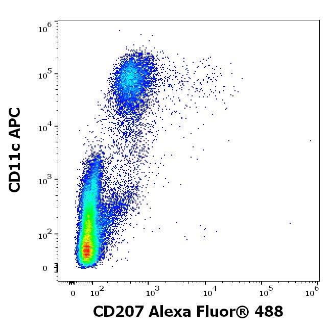 Flow cytometry multicolor surface staining pattern of human stimulated (GM-CSF + IL-4) monocytes spiked with human non-stimulated blood stained using anti-human CD11c (BU15) APC antibody (10 μl reagent / 100 μl of peripheral whole blood) and anti-human CD207 (2G3) Alexa Fluor® 488 antibody (4 µl reagent per milion cells in 100 μl of cell suspension).