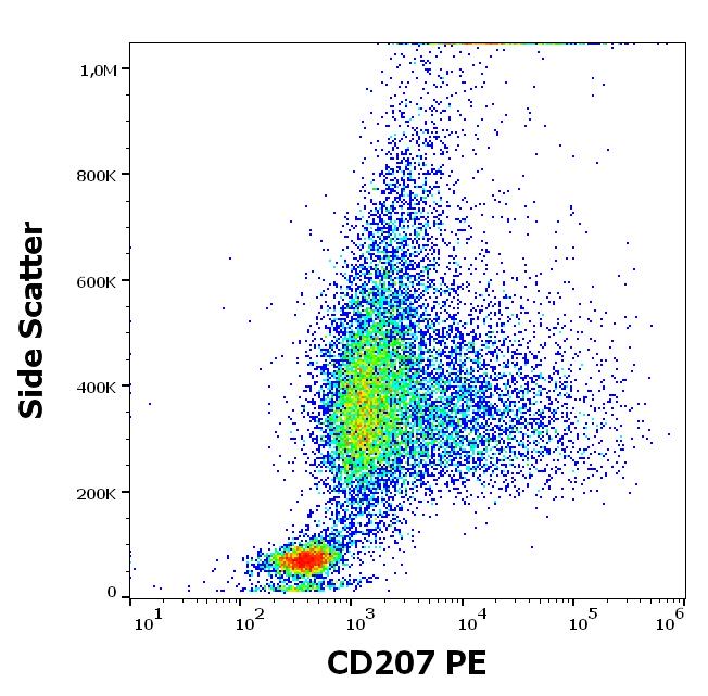 Flow cytometry surface staining pattern of human stimulated (GM-CSF + IL-4) peripheral blood mononuclear cells stained using anti-human CD207 (2G3) PE antibody (10 μl reagent per milion cells in 100 μl of cell suspension).