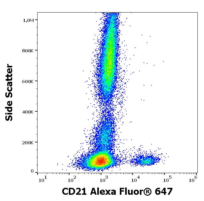 Flow cytometry surface staining pattern of human peripheral whole blood stained using anti-human CD21 (LT21) Alexa Fluor® 647 antibody (4 μl reagent / 100 μl of peripheral whole blood).