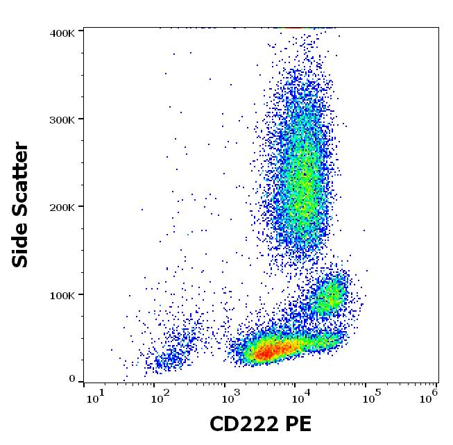 Flow cytometry surface staining pattern of human peripheral whole blood stained using anti-human CD222 (MEM-238) PE antibody (10 μl reagent / 100 μl of peripheral whole blood).