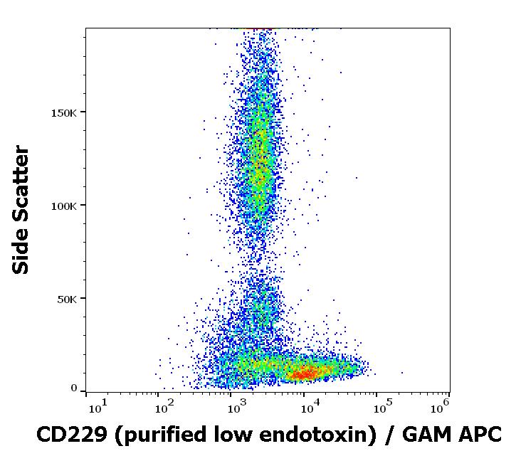 Flow cytometry surface staining pattern of human peripheral blood stained using anti-human CD229 (HLy9.25) purified antibody (low endotoxin, concentration in sample 16 μg/ml) GAM APC.