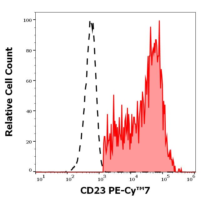 Separation of human CD19 positive CD23 positive B cells (red-filled) from neutrophil granulocytes (black-dashed) in flow cytometry analysis (surface staining) of human peripheral whole blood stained using anti-human CD23 (EBVCS-5) PE-Cy™7 antibody (concentration in sample 0.56 μg/ml).