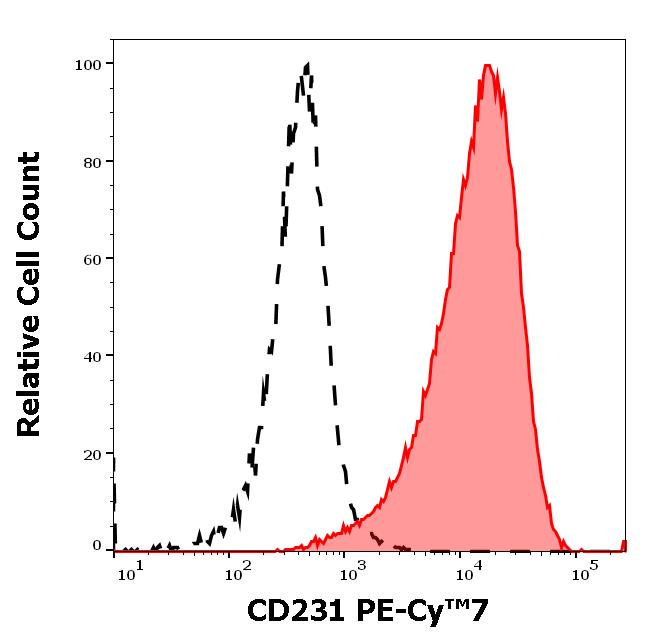 Separation of Jurkat cells stained using anti-human CD231 (BV10A4) PE-Cy™7 antibody (4 μl reagent per million cells in 100 μl of cell suspension, red-filled) from Jurkat cells stained using mouse IgG1 isotype control (MOPC-21) PE-Cy™7 antibody (concentration in sample 5 μg/ml, same as CD231 PE concentration, black-dashed) in flow cytometry analysis (surface staining) of Jurkat cell suspension.