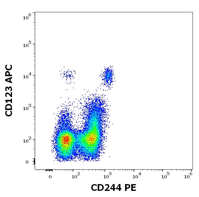 Flow cytometry multicolor surface staining pattern of human peripheral blood mononuclear cells using anti-human CD123 (6H6) APC antibody (10 μl reagent / 100 μl of peripheral whole blood) and anti-human CD244 (2-69) PE antibody (10 μl reagent / 100 μl of peripheral whole blood).