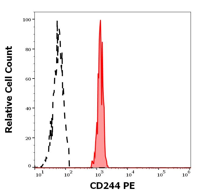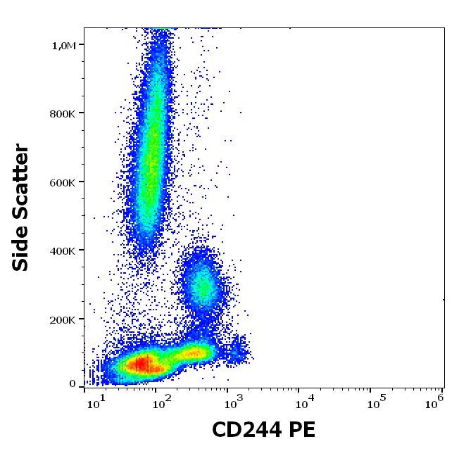 CD244 is a 70 kDa type I transmembrane glycoprotein containing four ITSM domains in its cytoplasmic part, serving as docking sites for both activating and inhibitory signaling molecules. Its extracellular ligand is CD48. CD244 is involved in non-MHC restricted cytotoxic activity of NK cells and acts as a costimulatory ligand for both NK cells and T cells. Interaction of CD244 with CD48 on T cells leads to the activation of both, but interaction with CD48 on other cells (e.g. tumor cells) can lead to inhibition of NK cell functions.