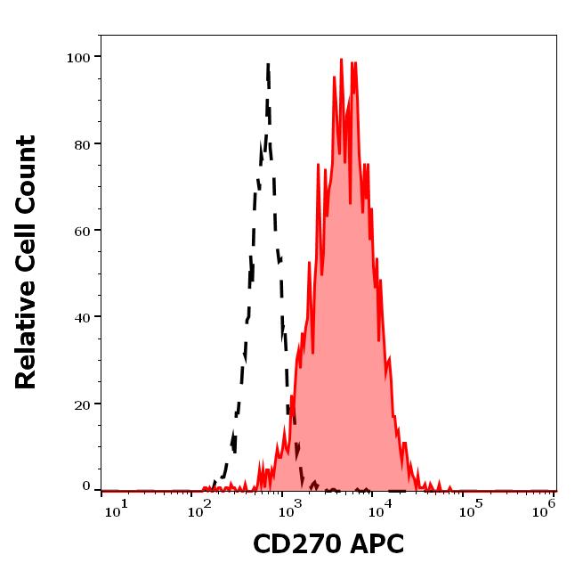 Separation of SK-MEL-30 cells stained using anti-human CD270 (CW10) APC antibody (10 μl reagent per million cells in 100 μl of cell suspension, red-filled) from SK-MEL-30 cells stained using mouse IgG1 isotype control (MOPC-21) APC antibody (concentration in sample 5 μg/ml, same as CD270 APC concentration, black-dashed) in flow cytometry analysis (surface staining) of SK-MEL-30 cell suspension.