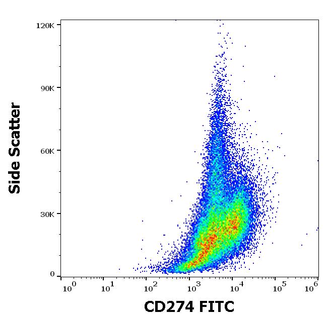 Flow cytometry surface staining pattern of human PHA stimulated peripheral blood mononuclear cell suspension stained using anti-human CD274 (29E.2A3) FITC antibody (4 μl reagent per milion cells in 100 μl of cell suspension).