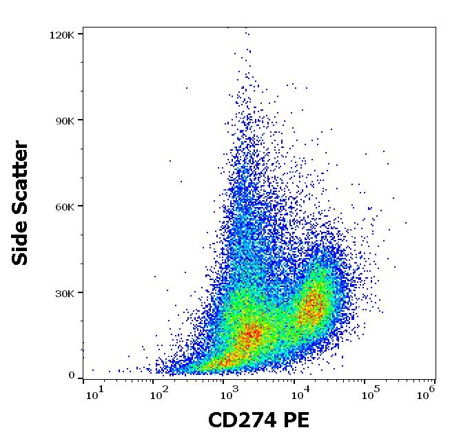Flow cytometry surface staining pattern of human PHA stimulated peripheral blood mononuclear cell suspension stained using anti-human CD274 (29E.2A3) PE antibody (10 μl reagent per milion cells in 100 μl of cell suspension).