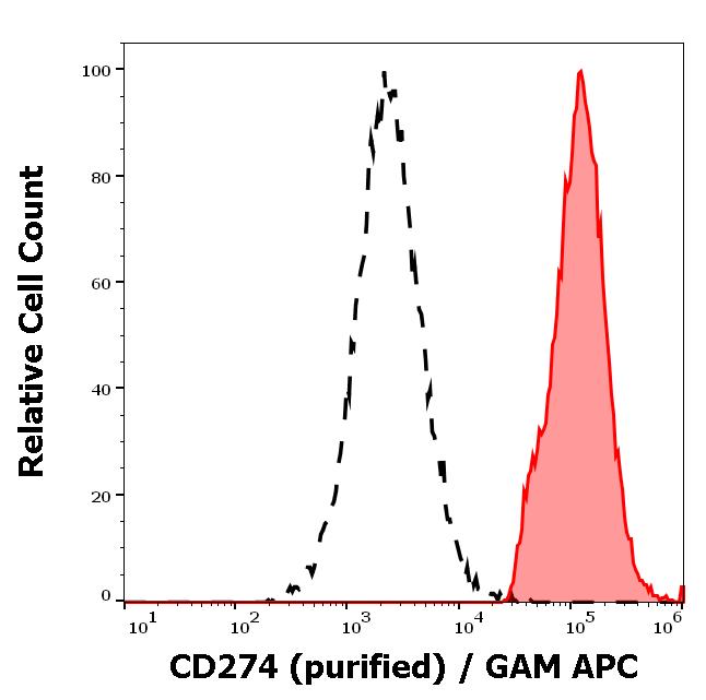 Separation of cells stained using anti-humam CD274 (29E.2A3) purified antibody (concentration in sample 4 μg/ml, GAM APC, red-filled) from cells unstained by primary antibody (GAM APC, black-dashed) in flow cytometry analysis (surface staining) of PHA stimulated peripheral blood mononuclear cell suspension.