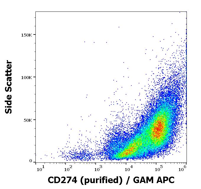 Flow cytometry surface staining pattern of human PHA stimulated peripheral blood mononuclear cell suspension stained using anti-humam CD274 (29E.2A3) purified antibody (concentration in sample 4 μg/ml) GAM APC.