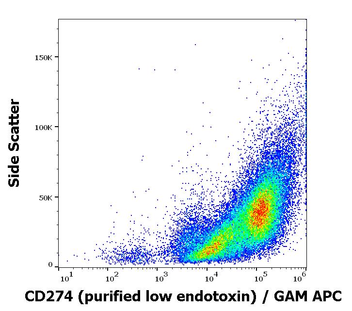 Flow cytometry surface staining pattern of human PHA stimulated peripheral blood mononuclear cell suspension stained using anti-humam CD274 (29E.2A3) purified antibody (low endotoxin, concentration in sample 4 μg/ml) GAM APC.