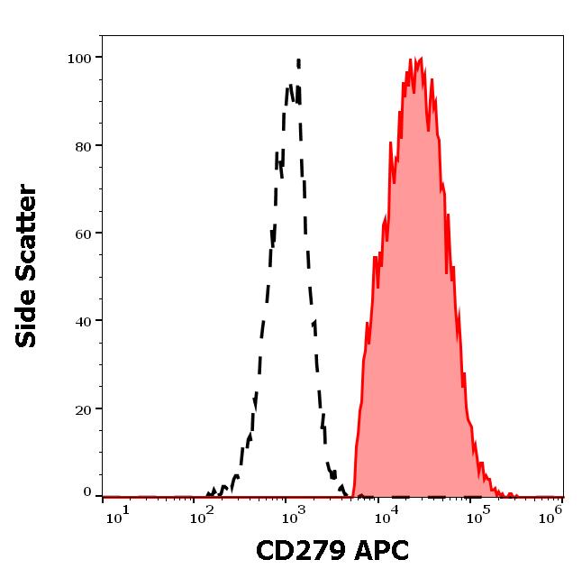 Separation of human CD297 positive cells (red-filled) from cellular debris (black-dashed) in flow cytometry analysis (surface staining) of human PHA stimulated peripheral blood mononuclear cells stained using anti-human CD279 (EH12.2H7) APC antibody (10 μl reagent per milion cells in 100 μl of cell suspension).