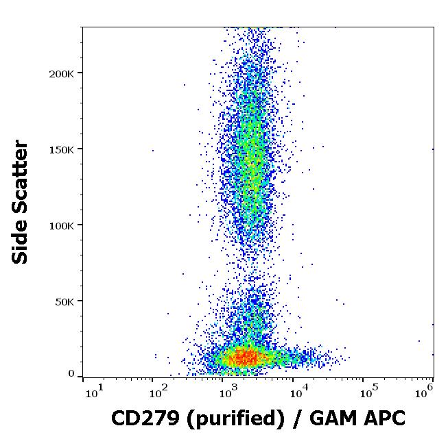 Separation of human CD279 positive lymphocytes (red-filled) from neutrophil granulocytes (black-dashed) in flow cytometry analysis (surface staining) of human peripheral whole blood stained using anti-human CD279 (EH12.2H7) purified antibody (concentration in sample 6 μg/ml) GAM APC.